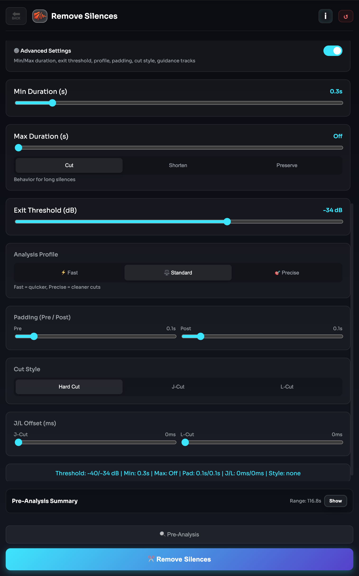 - Enter / Exit Threshold: Sessizlik giris/cikis esiklerini belirler.